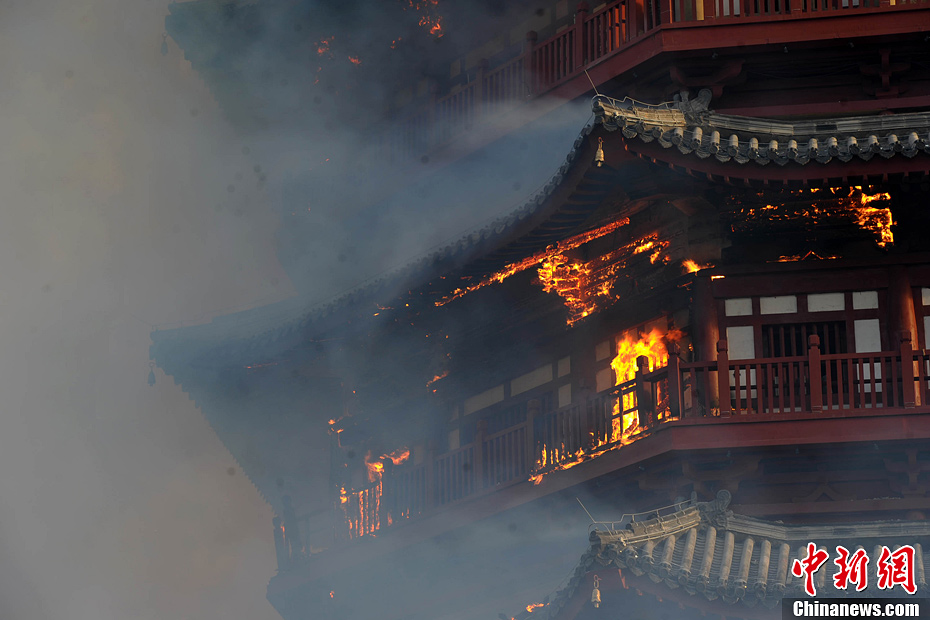 18时10分许,火势已蔓延到第六层。消防部门一位官员表示,消防水枪的压力不可能很大,水枪射程在15到30米之间,因为由消防员人工把持,压力太大了,可能会伤人,昨天着火现场不利因素较多,一是该塔在鹰山之上,周围还是工地,消防车道尚未形成,消防水枪和水炮无法接近火点,射程受限;二是风力很大,水柱被吹散了,很难形成充实水柱;三是建筑形式复杂,木质结构檐头梁架凹凸不平,不易被水射中。该官员说,目前北京消防有高喷车,射程可达50米,但是昨天的扑火环境非常复杂,因此没有派出。