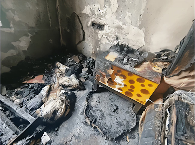 电蚊香的正下方,放置有一个收纳盒及一床棉被、衣物,发生火灾的当晚家中无人,火灾共造成卧室沙发、床及空调等被烧毁,客厅及餐厅墙面均被浓烟熏黑。