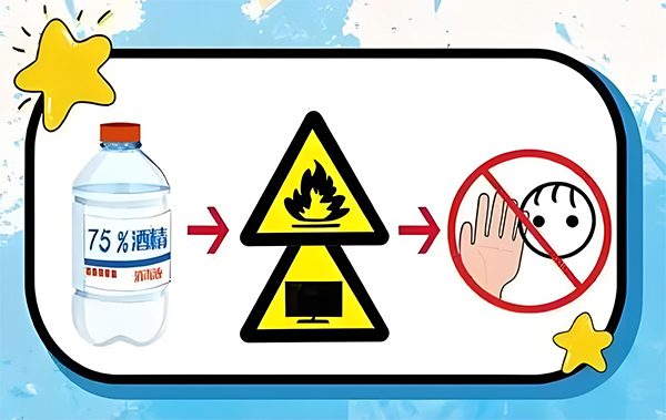 酒精燃点低,遇火、遇热易自燃,在使用时不要靠近热源、明火,给电器表面消毒,应先关闭电源,用酒精擦拭厨房灶台,要先关闭火源,以免酒精挥发导致爆燃。