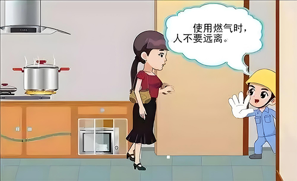 液化气使用时应有人看管,防止火焰被溢出的汤水浇灭或被风吹灭,造成燃气泄漏事故。