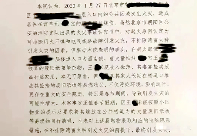 2020年1月27日,北京市朝阳区一居民王某某因在楼道堆放杂物引发火灾,致邻居被严重烧伤。最终判决王某某赔偿受害人全部费用633万余元的70%,即443万余元,物业公司对633万余元全额承担补充赔偿责任。
